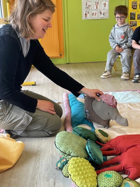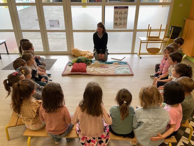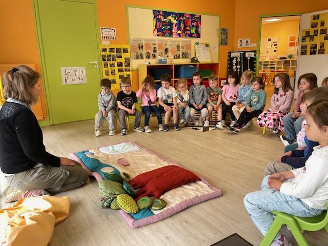A cause des travaux bruyants qui ont lieu à la bibliothèque, nous n’avons pas pu nous y rendre. C’est donc Christelle qui s’est déplacée jusqu’à l’école. Elle est venue avec son tapis de lecture pour nous raconter une drôle d’histoire : le machin.