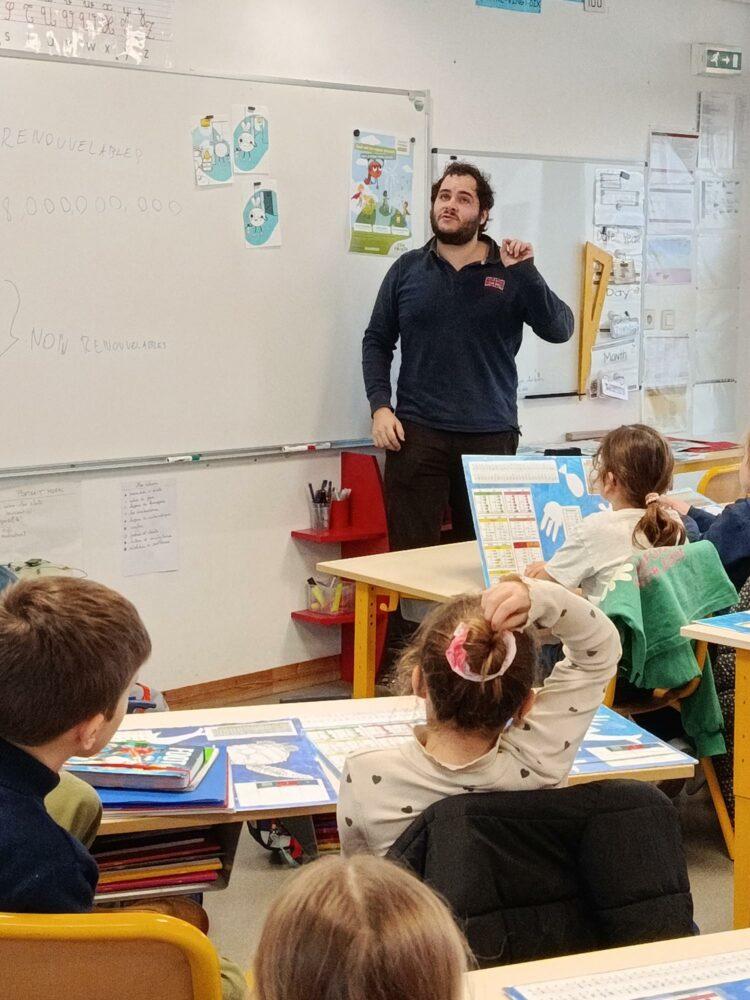 Lors son intervention en classe, nous avons abordé le thème des énergies et de leur importance dans notre vie quotidienne. Nous avons d’abord expliqué ce qu’est l’énergie et les différentes formes qu’elle peut prendre, comme l’énergie électrique, thermique ou mécanique. Ensuite, nous avons distingué les énergies renouvelables, telles que le soleil, le vent et l’eau, des énergies non renouvelables comme le pétrole, le gaz et le charbon.