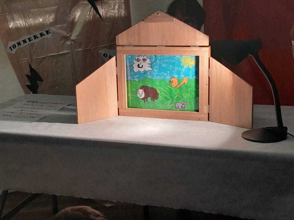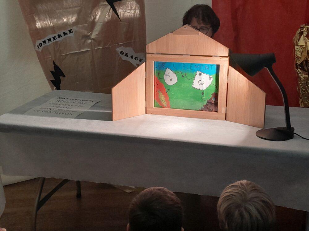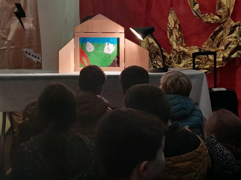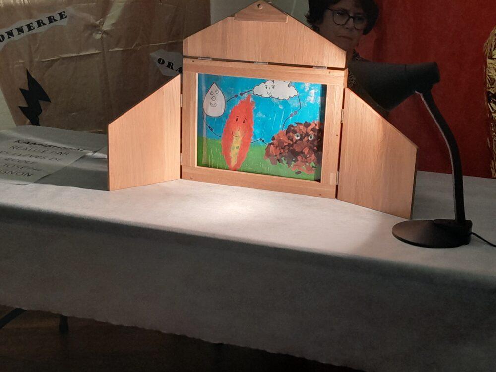 Le moment fort de cette exposition a sans doute été la présentation de leur kamishibaï, un petit théâtre de papier racontant une histoire originale mettant en scène les quatre éléments : l’eau, la terre, le feu et le vent. À travers leurs dessins et leur récit, les élèves ont montré comment ces éléments se rencontrent, se complètent et créent ensemble l’équilibre du monde.