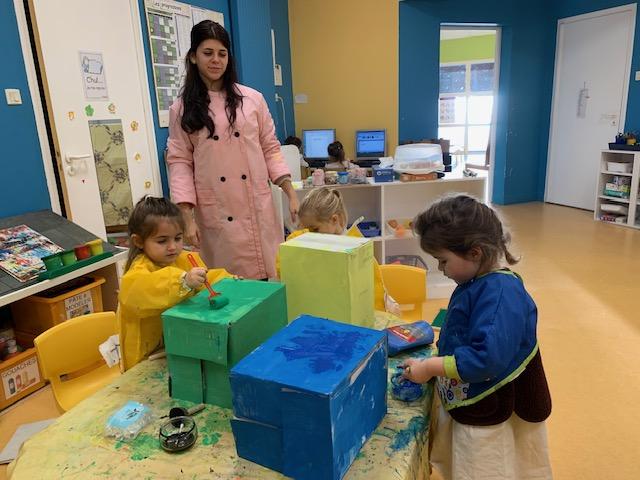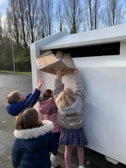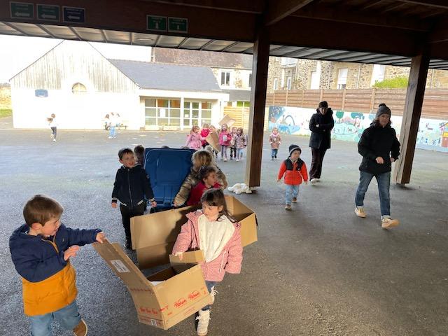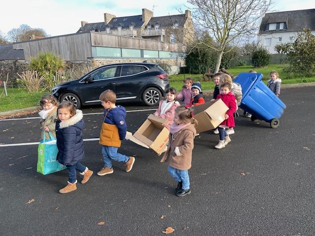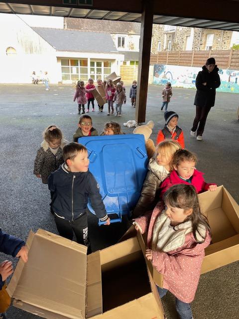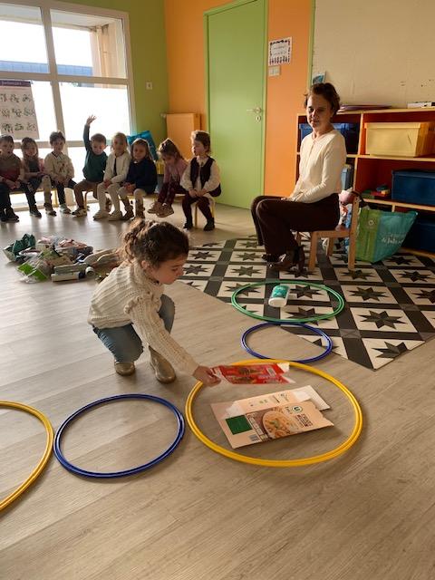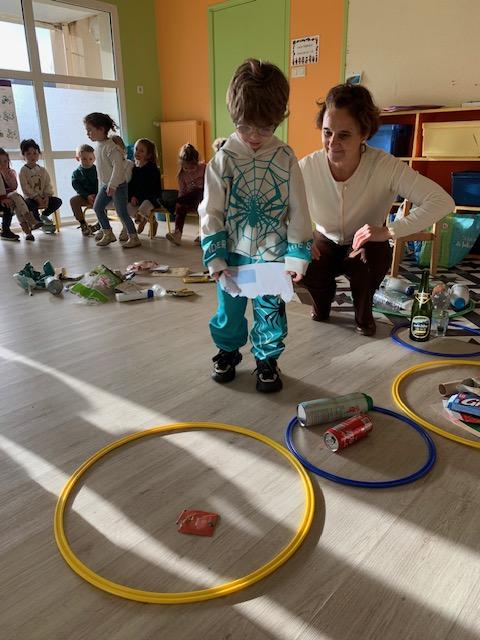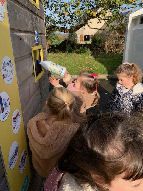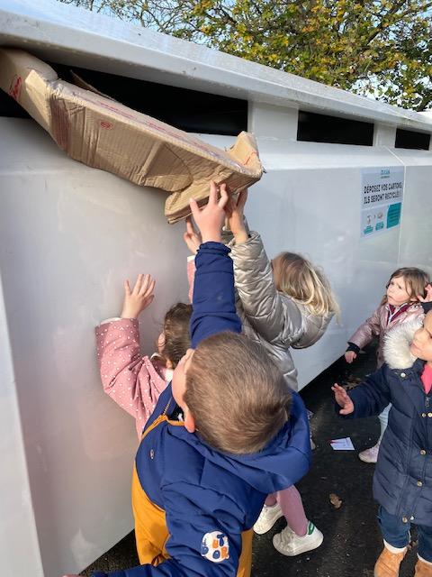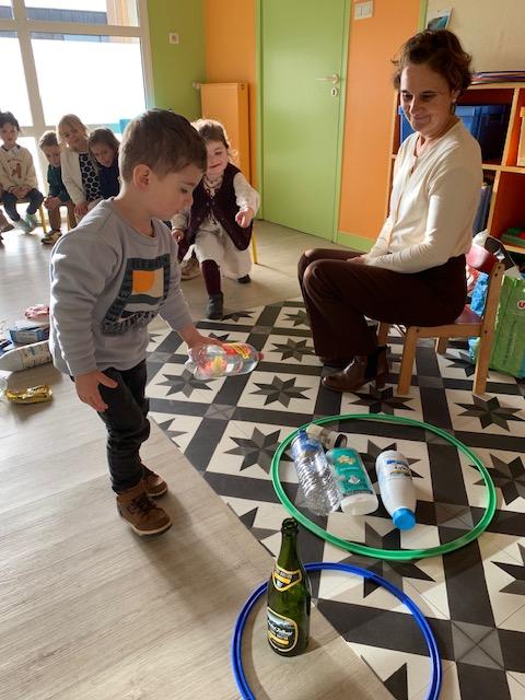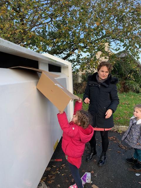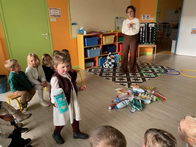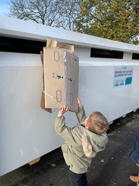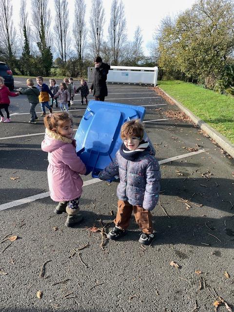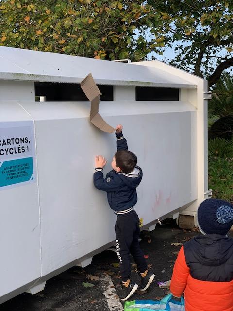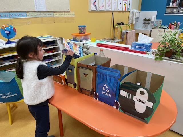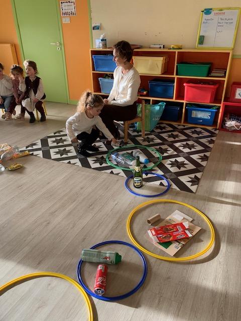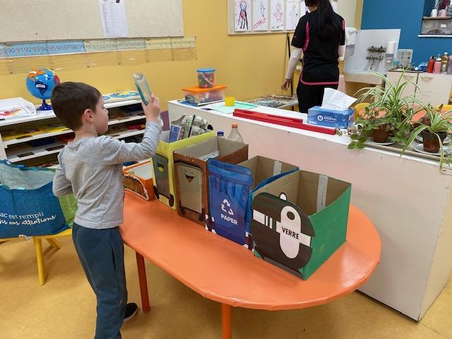 Nous avons abordé le tri des déchets et le recyclage et avons fabriqué des poubelles de tri pour nous entraîner. Nous sommes aussi allés jusqu’aux containers situés sur le parking de l’école.