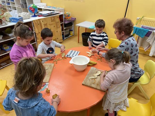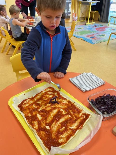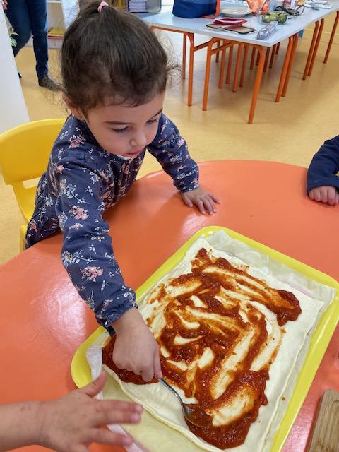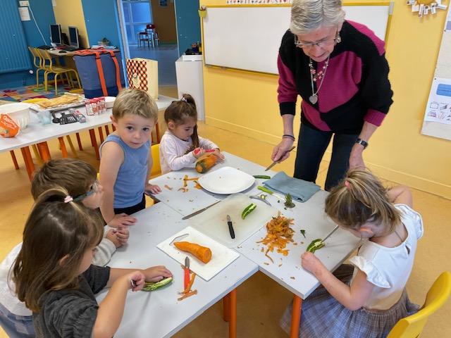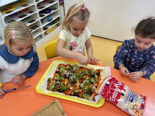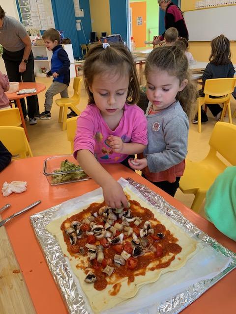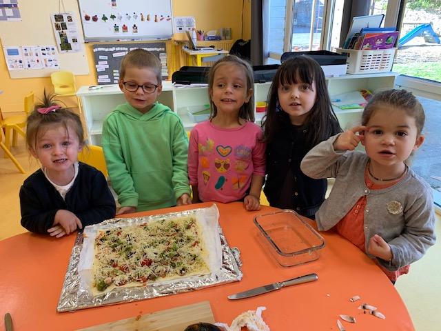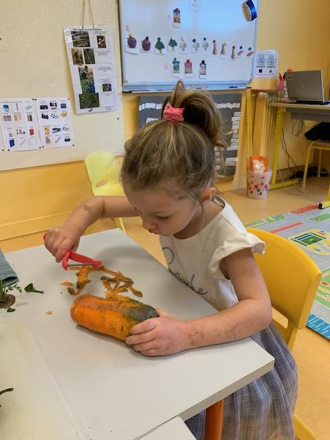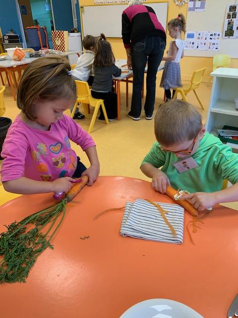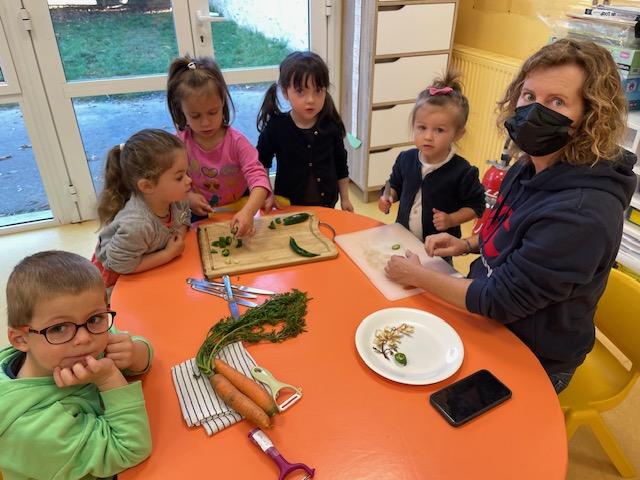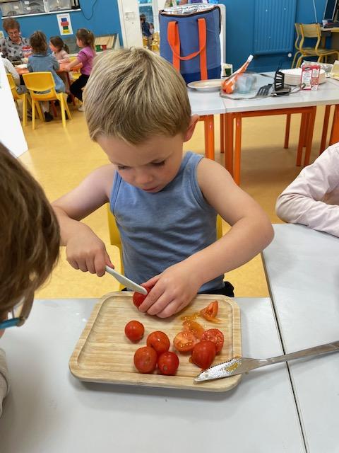Nous avons vécu 2 moments forts lors de cette semaine 7 : lundi, nous avons fait classe dans la nature et vendredi, nous avons cuisiné notre repas du midi : crudités, pizzas aux légumes, salades de fruits, pizzas au chocolat.