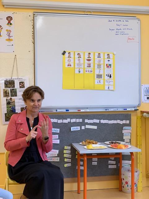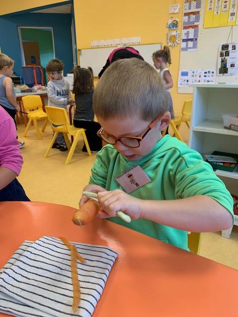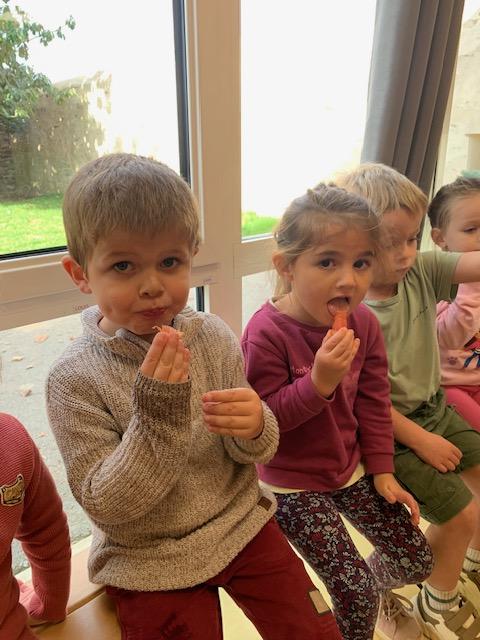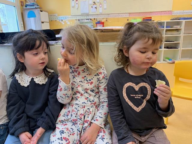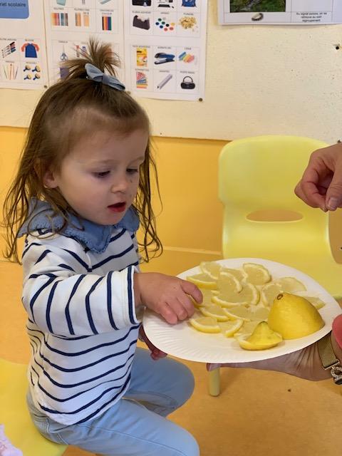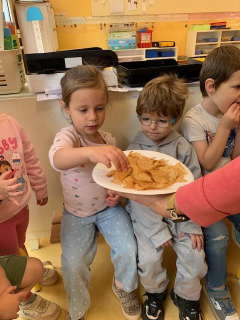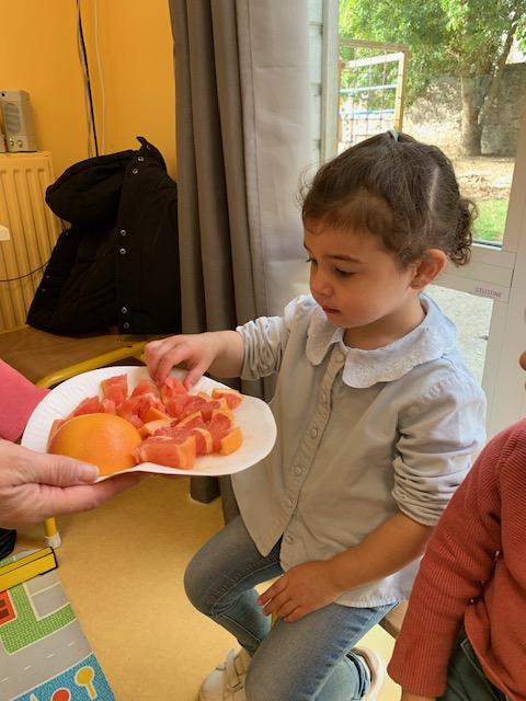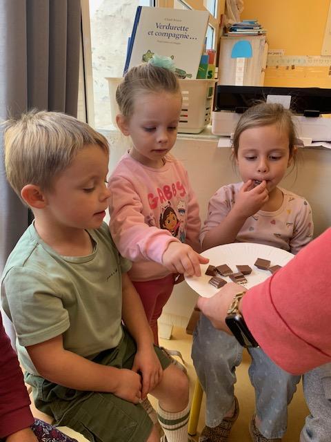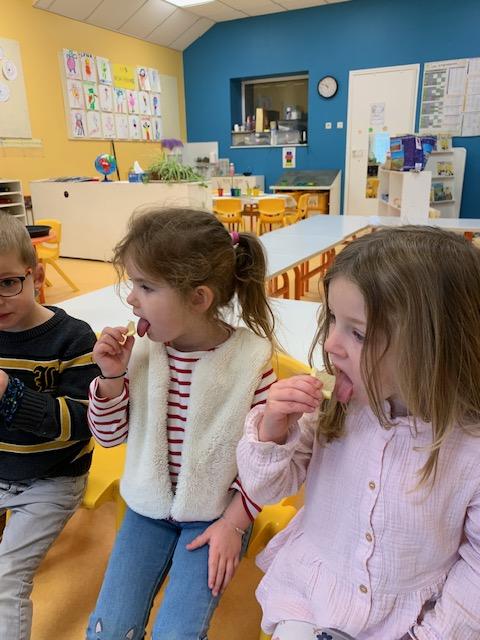 Nous avons aussi découvert les différentes saveurs en goutant des aliments : l’acide avec le citron, l’amer avec le pamplemousse, le salé avec les chips et le sucré avec le chocolat.