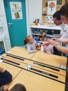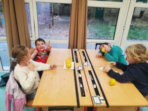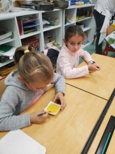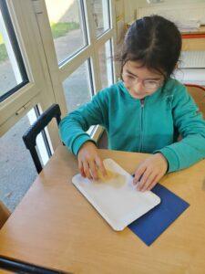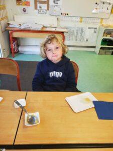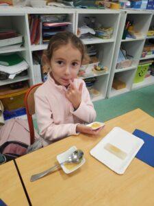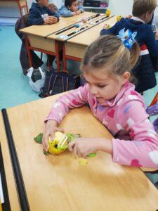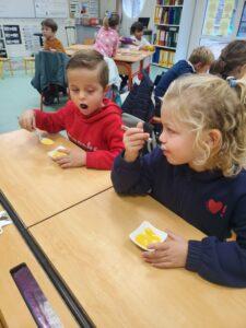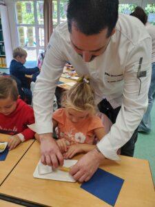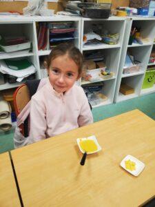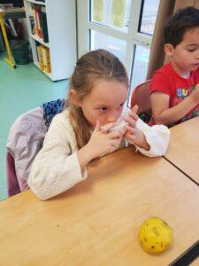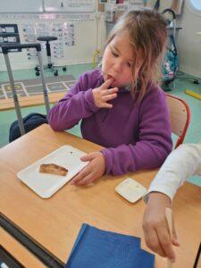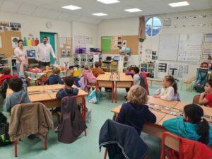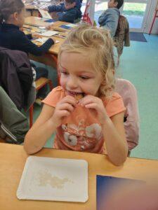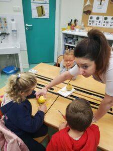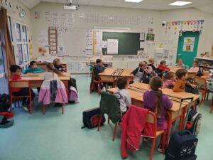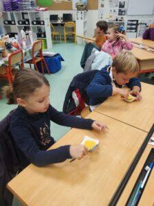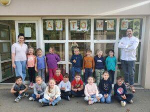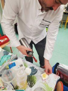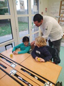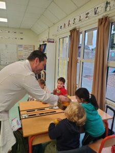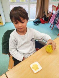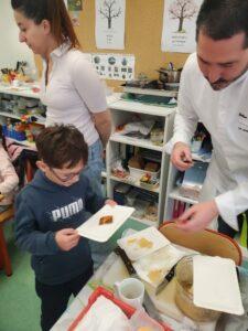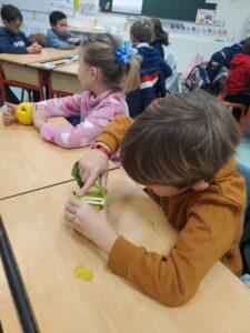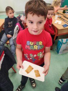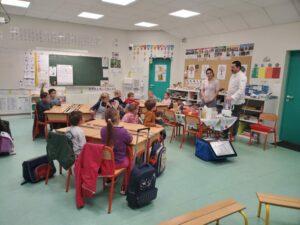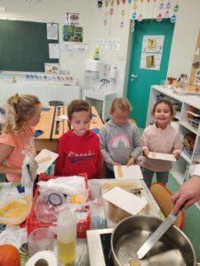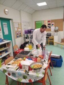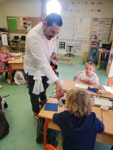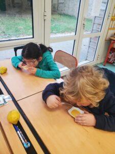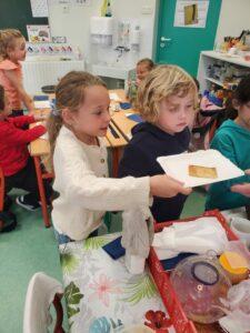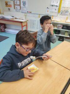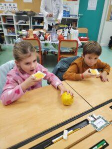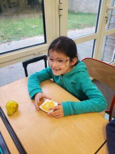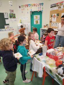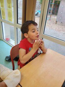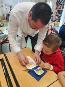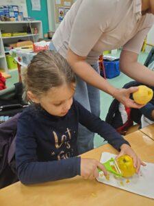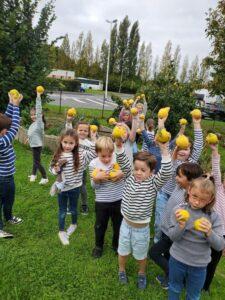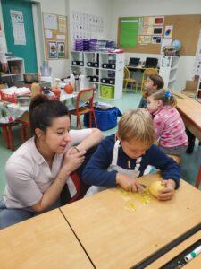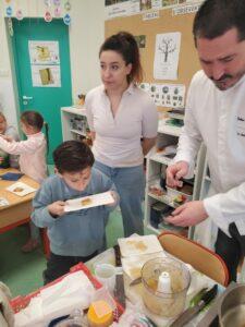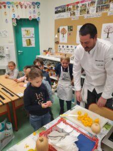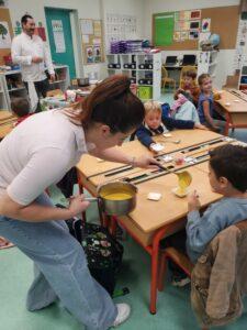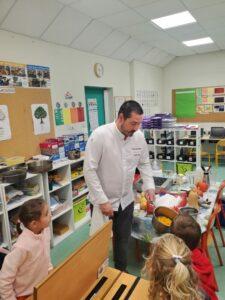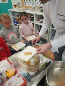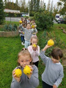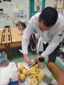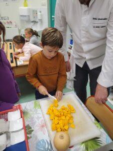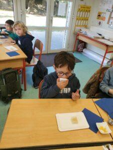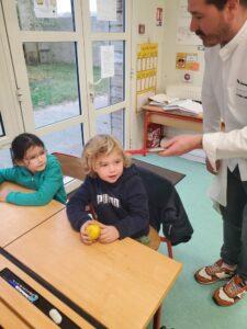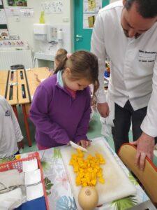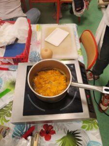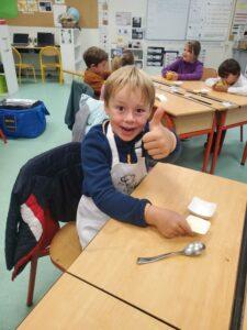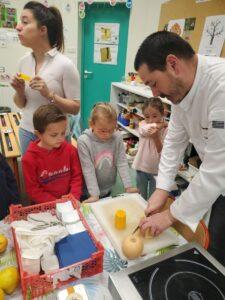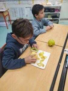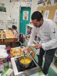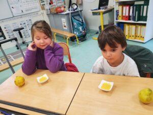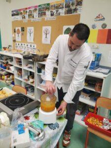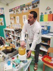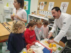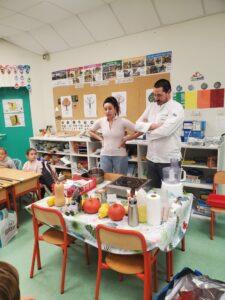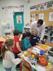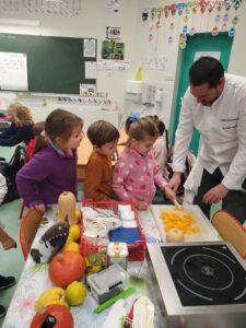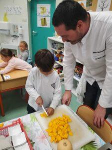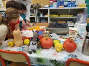 A l’occasion de la semaine du goût, Monsieur et Madame GOURMELEN, les parents de Maël, sont venus en classe pour cuisiner avec les élèves des produits de saison : la courge butternut et les coings de notre jardin.